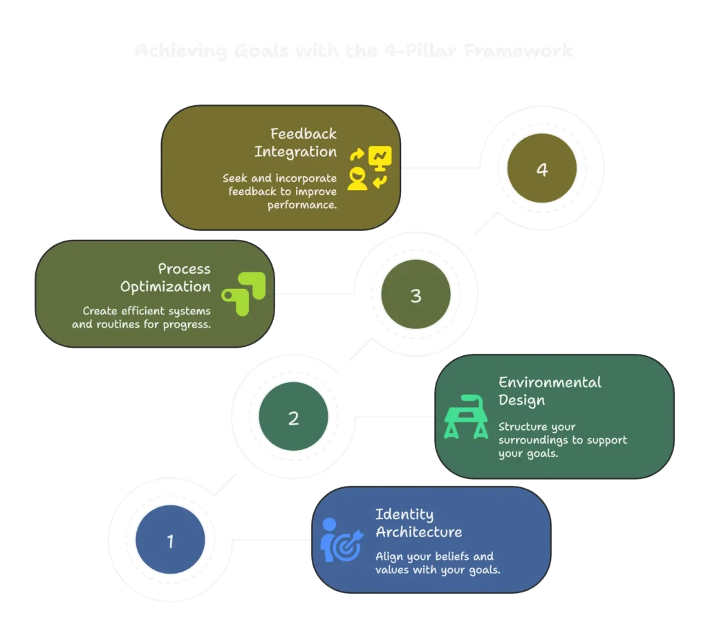 Our comprehensive framework rests on four interconnected pillars that work together to create what we call “inevitable achievement.” Each pillar addresses a critical component of sustainable goal pursuit: